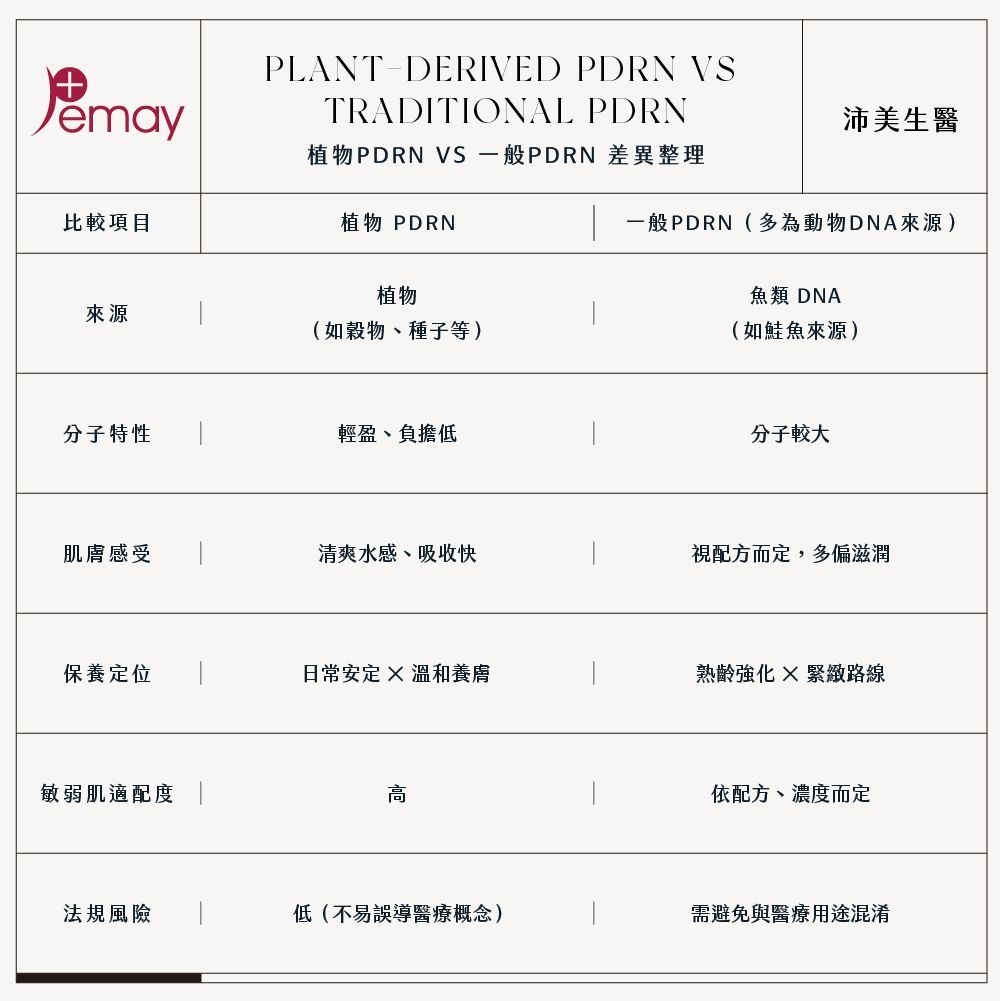 傳統大家常聽到的 PDRN 是來自動物 DNA(多為魚類來源)的原料;而 植物 PDRN 則是以植物為來源,萃取出其中的核苷酸(Nucleotides)與溫和植萃複合物。兩者名稱相似,但在保養品領域的定位完全不同,也沒有互相替代關係。