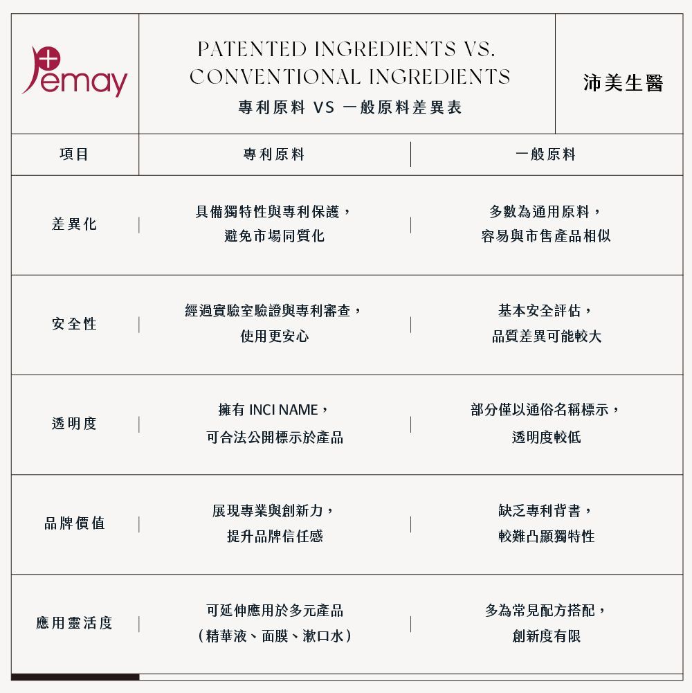 這些專利原料不僅是技術成果,更是沛美協助品牌打造獨特市場定位的堅實基礎 。