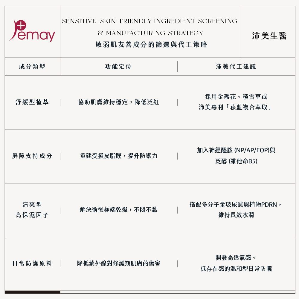 針對醫美術後與敏弱肌代工,沛美生醫堅持「精簡、安全、低負擔」的配方哲學,我們將原料歸納為四大核心支柱,協助品牌精準卡位: